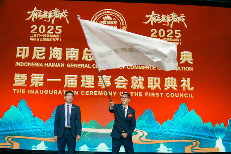 在热烈的掌声中,第一届理事会成员正式就职,卢会长接过象征责任与使命的会旗并发表就职演说。他表示,商会不仅是琼印企业互通有无的商业桥梁,更是所有琼籍乡亲在印尼的温暖港湾,未来将推行轮值会长等创新机制,践行“大家的商会大家办”的理念,让商会成为凝聚乡情、共促发展的坚强纽带。现场还举行了高级顾问聘任仪式,印尼国家相关领导受邀担任商会高级顾问,他在致辞中承诺,印尼政府将为海南企业提供更便利的营商与签证环境,全力支持商会推动实质性合作项目落地。