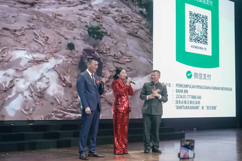 “文化交融,乡情浓厚”,祥狮引路,鼓点震彻全场,既有传统文化的厚重底蕴,又有庆典开篇的热烈气场,彰显了对贵宾的尊崇礼遇。现场还举行了精彩的文艺表演,并邀请来自海南的音乐唱作人蔡文君倾情出演,其中由中国政协委员、中国侨联常委张继焦教授创作的《根在海南》在现场深情唱响,引发思乡共鸣,活动中途印度尼西亚海南总商会主席芦克明先生,特意安排歌手演唱《爱的奉献》,携手全体同仁以及来自海南的企业家们,一起为印度尼西亚受特大洪灾的灾区捐款,在芦克明主席的呼吁下,现场嘉宾纷纷慷慨解囊奉献爱心。活动期间芦克明主席不但给灾区捐款同时又给海南纪录电影“天涯水尾”剧组赞助五十万元人民币的拍摄经费。