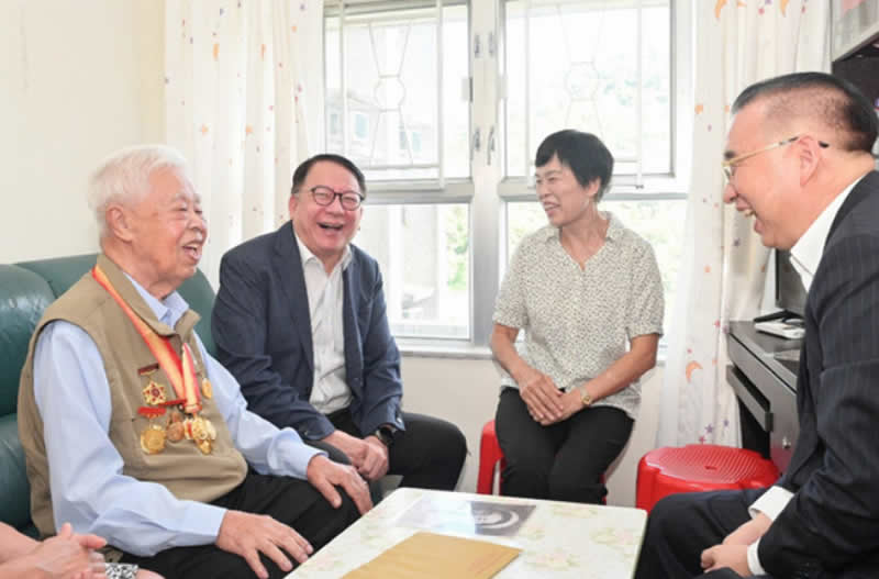 政务司司长陈国基、民政及青年事务局局长麦美娟今日分别与中央人民政府驻香港特别行政区联络办公室副主任刘光源、中联办秘书长王松苗上门探访三位在港并曾参加抗战的老兵,向他们表达慰问和关怀。