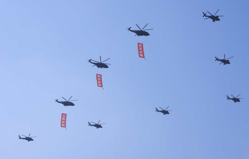 9时44分,空中护旗梯队率先亮相,揭开阅兵分列式的序幕——3架直升机分别悬挂中国共产党党旗、中华人民共和国国旗、中国人民解放军军旗迎风向前,26架直升机组成巨大的“80”字样,3架直升机分别悬挂“正义必胜”“和平必胜”“人民必胜”条幅飞过天安门广场。