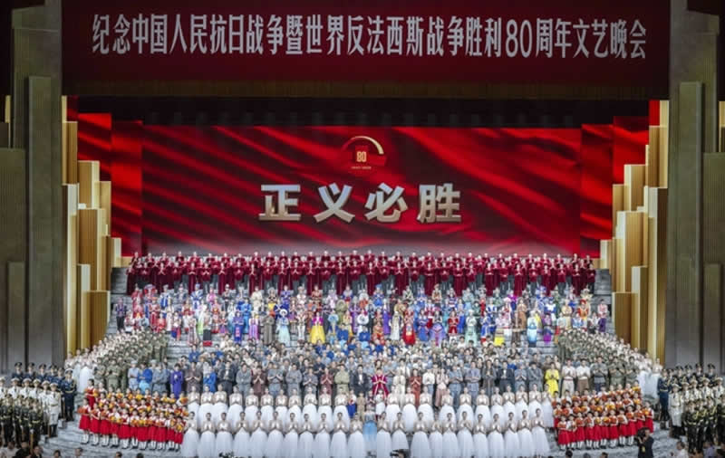 9月3日电 歌声嘹亮,唱响胜利华章;舞姿雄壮,展现正义力量。纪念中国人民抗日战争暨世界反法西斯战争胜利80周年文艺晚会《正义必胜》3日晚在北京人民大会堂隆重举行。习近平、李强、赵乐际、王沪宁、蔡奇、丁薛祥、李希、韩正等党和国家领导人,与约6000名中外人士一起观看晚会,共同纪念这个光辉的日子。