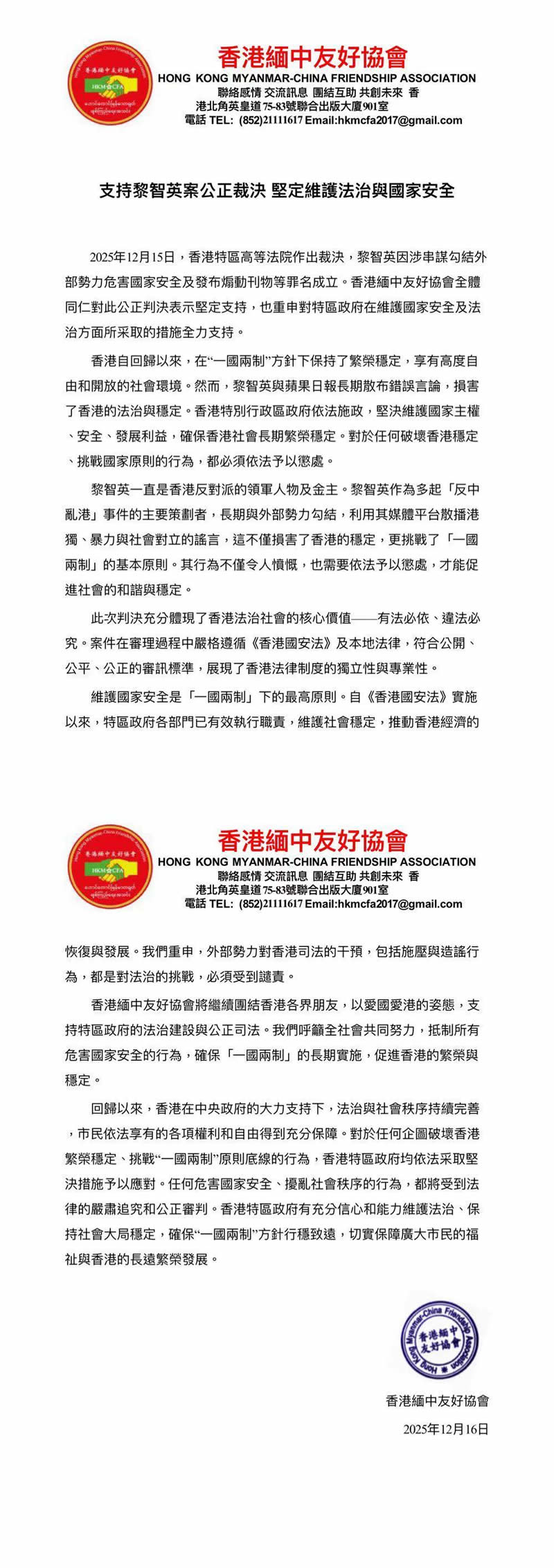 2025年12月15日,香港特區高等法院作出裁決,黎智英因涉串謀勾結外部勢力危害國家安全及發布煽動刊物等罪名成立。香港緬中友好協會全體同仁對此公正判決表示堅定支持,對特區政府在維護國家安全及法治方面所采取的措施全力支持。
